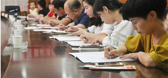 没有音乐,没有掌声,没有隆重的仪式。除了墙上挂着两条与活动相关的横幅,会议室内没有其他装饰。志愿者们陆续到来,围坐在会议桌前。马屿镇红十字爱心志愿队队长、此次人体器官捐献登记活动发起人姚笃树说,来的人比之前在微信上报名的人数要多。之前在微信上报名的有26人,现场来了28人。