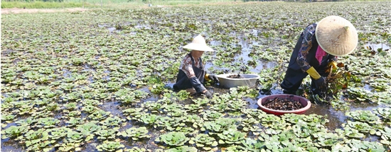9月5日,陶山镇珊瑚生态种养场的蔡正珊正和农户一道,在绿油油的菱角池里忙采菱。 “清明时节种下的50亩菱角,这几天长势很好,结出了不少的嫩菱,菱角迎来大丰收,每天都能收个上百斤,预计每亩有500公斤的产出,总产值有10多万元。加上在田里还养着黑鱼等,一年下来收入可观。”蔡正珊说,“眼下正是吃菱角的最佳时节。估计还能再采摘一个月左右,市民可以前来采摘,体验农耕生活。”
