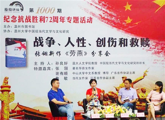 张翎的《劳燕》分享会设在温州市图书馆二楼,我们一家顾不得吃中饭,提早40分钟赶到会场。分享会由温州大学教授孙良好主持,嘉宾除了张翎,还有谢有顺、鲁敏,都是当今文坛风头正盛的作家。