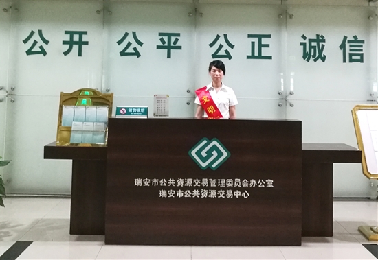 一进入市资管办大厅,佩戴着“文明服务岗位”绶带的员工金美绿笑脸相迎。“过来投标的人有业务方面的疑惑,我都会及时给予引导与帮助。”她说。
