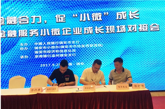 在当天的融资对接会现场,浙商银行瑞安支行、招商银行瑞安支行等32家银行积极参与,与小微企业负责人面对面沟通,现场推介为小微企业量身定做的金融产品和服务。经过对接,5家银行现场与10家小微企业授信签约,签约总金额达3680万元。