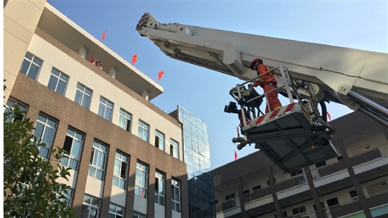 清点人数后,主楼顶层3名来不及逃生的学生挥舞毛巾,等待施救。市公安消防局救援人员到达后,立即开展登高救人。他们将登高平台消防车开至救援点,迅速将支撑脚架好,并由一名救援人员进入操作平台,逐渐接近被困学生,3名学生顺利进入高空救生笼里,并缓慢下降,此次登高救人演练圆满结束。随后,现场又开展了灭火演练。
