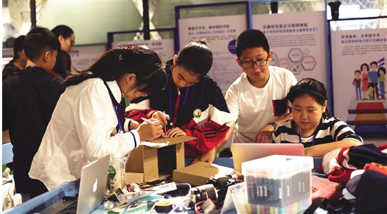 这是“创客马拉松”的比赛现场。青少年创客们发挥奇思妙想,利用场馆里所有的材料和工具,在两天的时间内制作一个或温馨、或搞怪、或奇葩的小机器人,让它成为学习、生活中温暖的小伙伴,并展示、阐述各自作品创作的原理与初衷。