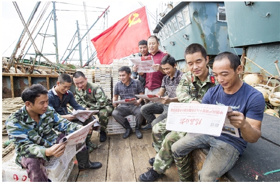 在市残联会议室,市残联工作人员通过报纸向肢残人士讲解习总书记所作的报告(如图一);在东山渔港码头,市边防官兵登上渔船和渔民们一起学习习总书记所作的报告精神(如图二)。大家纷纷表示,该报告为中国未来向前发展绘制了宏伟蓝图,听后备受鼓舞,倍感振奋,心里充满期待。接下来将认真学习、贯彻落实十九大精神,立足本职工作,为决胜全面建成小康社会,实现中华民族伟大复兴的中国梦贡献自己的力量。