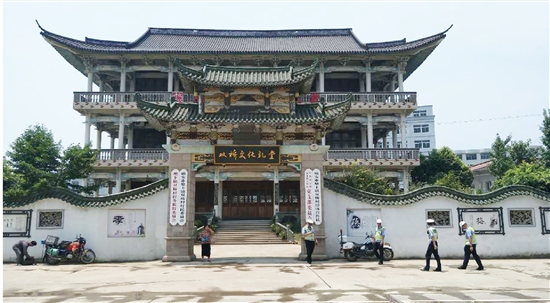 进门后,面前的三层建筑楼是罗山文化活动中心的主体,木门、飞檐、黑瓦,透着传统楼阁的风格。三层建筑楼旁边是党建主题公园,一块大草坪上立着一面党旗,后方5颗五角星紧紧环绕。公园走廊边还开设了罗山文化展示区,展示村情、村史及流传在大罗山一带的故事。