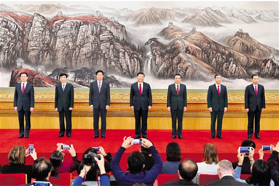 10月25日,刚刚在中国共产党第十九届中央委员会第一次全体会议上当选的中共中央总书记习近平和中共中央政治局常委李克强、栗战书、汪洋、王沪宁、赵乐际、韩正在人民大会堂同采访十九大的中外记者亲切见面。 新华社记者 李涛 摄