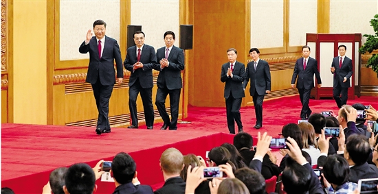 习近平向大家介绍了中共中央政治局常务委员会的其他成员后,代表新一届中共中央领导成员衷心感谢全党同志的信任,表示一定恪尽职守、勤勉工作、不辱使命、不负重托。
