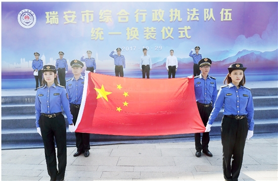 10月29日上午,市综合行政执法局300多名执法人员在明镜公园举行统一换装仪式。全体执法人员身着蓝色崭新制服,整队列,宣誓词,面对国旗行注目礼,这标志着我市城市管理执法工作开启了新征程。 (记者 张洵煜)