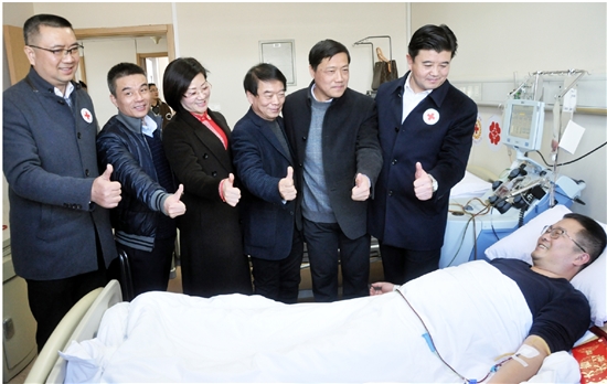 孔庆吉站在床边,用关爱的语气跟黄骥说:“你的事情特别让我感动,为你的大爱点赞。你传播了正能量,发出了好声音。你的大爱情怀、担当善举都值得大家学习。”