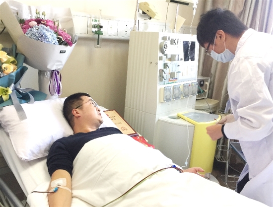 昨日上午,温州医科大学附属第一医院的血细胞分离室里,黄骥双臂静脉插着带细皮管的针头,皮管连着仪器,血液从右臂抽出来,又流回左臂,转动的仪器里留下血液中的造血干细胞。黄骥的父母陪在一边,时不时问他需要什么,黄骥总是笑嘻嘻地回应:“没事,不需要。”笑声爽朗,话语幽默,让在场的探望者和医护人员感受到了这位年轻人热血洋溢的“正能量”。