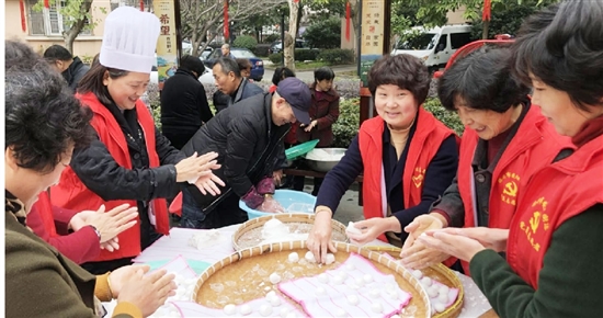 9时许,位于育才社区华瑞豪庭的文化家园小广场上热闹非凡,大红灯笼装点着广场,十几位志愿者围在广场中央的圆桌上揉面团、搓麻糍。“起锅了!”热腾腾的麻糍在红糖中翻滚,裹上一层厚厚的“外衣”后被装入一个个小盒子,分到居民的手中。