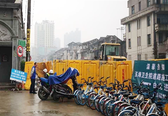 记者注意到,邮电北路路口停放了很多共享单车,这是怎么回事?据了解,邮电北路封闭施工后,位于邮电北路的玉海街道卫生院和玉海派出所仍正常办公,在道路东侧留下一条窄道供行人通行,一直到邮电北路与公园路的交叉路口,最宽的地方约2米,最窄的地方需要侧身经过,并且中途还有许多地方被挖,因而即使骑自行车,也很难通行。