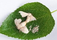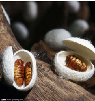 成蛹化蛾:当成型的茧完成后,需要2周左右的时间便会化蛾。雌雄蚕蛾破茧后不久便会进行交尾,交尾后雌蛾花费4至5小时产下卵,然后慢慢死去。雌蛾一次大约可产卵400余个。如果保护的好,来年春天,这些蚕卵还可以再次孵化。