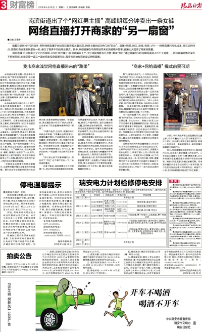 如今,网络直播越来越泛娱乐化,越来越大众化,正在走入更多普通人的生活中。从年初各大直播平台的“火爆”景象来看,2018年将是网络直播迅速占领用户市场的关键年。“商家+网络直播”的模式前景可期。而淘宝丰富的内容生态正在吸引一批有态度、有个性的内容创业者从中脱颖而出。相信不久以后,我市将涌现越来越多的“网红直播”。