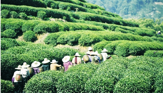 由于雨水绵绵,一路雾气蒙蒙,一溜青绿的茶树嫩叶无比茂盛,因风雨而轻轻摇曳,有节奏的舞动。此时,呼吸到的不仅是清香,更有沁人心脾的清鲜。远处一排排的茶树空隙,成群的采茶女身披雨衣,头戴斗笠,背负竹篓,动作娴熟地摘下嫩芽,一边双手飞动,一边相互大声交谈,传到我的耳边就是一首首悦耳动听的采茶曲,非常和谐优美,简直已是人茶和一的舞台剧景。