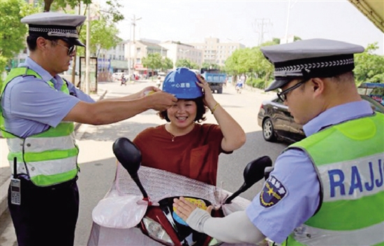 日前,我市举办“送安全,戴头盔,赠头盔”公益活动,免费发放头盔1500个左右,遍及各乡镇街道,营造了“警爱民、民拥警、警民亲如一家人”的良好氛围。 (通讯员 孙德胜)