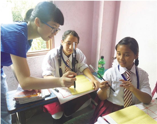 刚刚考上杭州师范大学钱江学院的十中毕业生林晓然,是一位书法爱好者。在课堂上,她手把手教当地孩子学习中国书法。“毛笔、纸张、墨汁都是从国内带过来的。他们对书法非常感兴趣,写得很认真。”林晓然告诉记者。