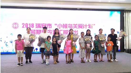 本报讯(实习生 林露露 记者 林翔翔)8月8日下午,由市总工会主办的“小候鸟关爱计划”职工子女暑期夏令营汇报演出在瑞安电商文创园举行,历时一个多月的夏令营圆满落下帷幕。当天,百余位职工及子女到场观看,“小候鸟”们用街舞、歌唱、朗诵、拉丁舞等向大家展示了参加夏令营的丰硕成果,并向老师们献上鲜花。