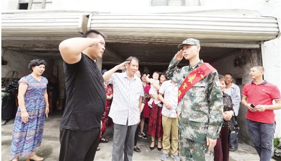 “到了部队,要听班长的话,要遵守部队纪律。”“要认真学习、苦练本领,争取当一名优秀的士兵。”昨日,记者在塘下镇欢送新兵现场,看见一位父亲正在给儿子作入伍前的叮嘱,一旁年近80岁的老爷爷则拉着这名新兵的手,轻声地嘱咐着。三人说完后,相互朝对方敬了军礼。