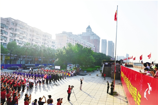 10月1日7时,外滩曾联松广场上,武警瑞安边防大队三名旗手迈着坚实的正步,精神饱满地走向升旗台……当日,电力、公安、学生代表和社会各界数百名群众会聚在这儿,注视国旗升起,表达对祖国母亲69周年华诞的美好祝福。