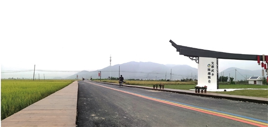 许大线上,彩色的道路分割线为沥青路面增添几分绚丽,沿着木栈道上漫步,视线所及尽是金灿灿的稻田,路边古香古色的道旗向游客讲述曹村故事;钱马线许岙段路面由7米增至12米,沿线房屋全部实施立面改造,待人行道、绿化带完工,将是一道“瓯派民居”的美丽乡村风景线。