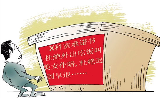 杜绝开发商请客吃饭与办证速度挂钩”“杜绝交100元钱才能办证”“杜绝外出吃饭叫美女作陪”“上下班坚决不迟到早退”……这两天,湖南衡阳市不动产登记中心权籍调查科的集体承诺书在网上引发热议。 (陶小莫 画)