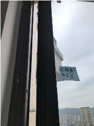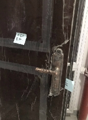 问题总结:大门多处刮伤;防震条脱开、破损;锁片生锈;合页接合有问题导致母门闭合不自然,有异响;门框被水泥污染,且缺少盖帽。