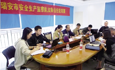 据悉,这是我市安监系统首次举办安全生产监察执法岗位技能竞赛,在温州各县(市、区)也属首例。竞赛内容分为理论测试、现场安全隐患查找、安全生产法律法规适用及法律文书填写等三部分。最终,莘塍街道安监所摘得团体一等奖,陈永法、蔡庆朋、孙建全等获得个人总分前八名。