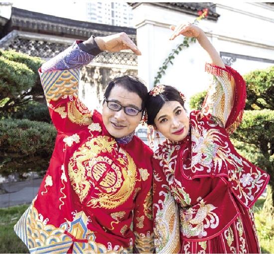 新郎蟒袍玉带,新娘凤冠霞帔,5对新人行走在忠义街上,使得这条古色古香的老街显得格外喜庆。新人们在这里取景拍照,不少路人则拿出手机记录下这一美好瞬间。新郎林友建和新娘时尚是聋人,两人在2015年通过“阳光鹊桥”相识,经过几年的相处,在亲友的见证下,他们步入婚姻的殿堂,也收获了大家满满的祝福。
