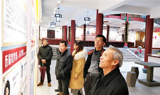 在礼堂大厅走廊,记者看到一些村民正在围观展板上的村史村情、乡风民俗、崇德尚贤、美好家园、凡人善举、时事政治,以及大厅后墙上周行己生平事迹等。