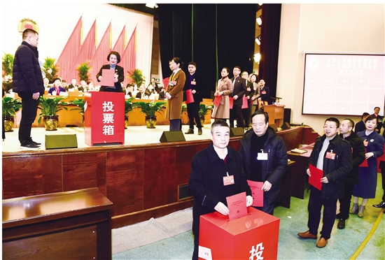 9时30分许,大会主持人宣布投票开始。伴随着欢快的乐曲声,委员们井然有序地排起队,走向票箱,投下自己神圣的选票。