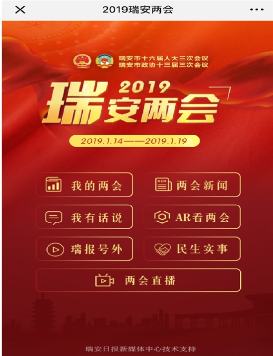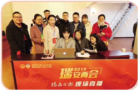 会中,注重发挥融媒体优势,瑞安日报、瑞安发布微信平台、瑞安网、瑞安日报微信公众号、浙江新闻客户端瑞安频道等多个平台集中发力,开辟两会专题,运用AR技术、抖音、电子号外等新手段,权威发布两会最新消息,全面解读两会精彩内容。内容涵盖“两会早知道”“代表委员建言录”“我从基层来”“建议提案精彩回放”“两会图片”等诸多栏目内容;还进行三场图文现场直播,分别是政协、人大开幕会和人大第二次全体会议,三次直播点击量均超万次;制作2019政府民生实事项目H5《2019,奔跑吧瑞安》,点击量9000余人次。