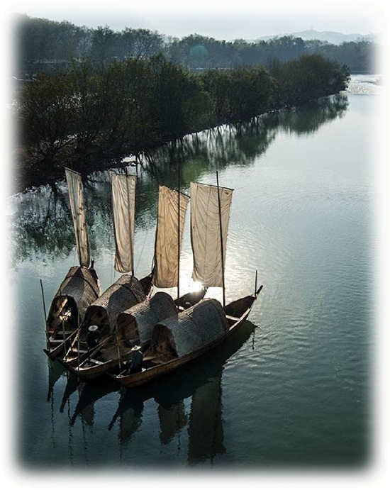 乘舟顺流而下。湛蓝的天空,碧绿的江水,俯仰间两岸美景尽收眼底。舴艋舟在江面上悠悠地飘着,偶有几只白鹭翩然掠过晴空,风轻轻地掠过舟侧,带起一缕缕剪不断理还乱的思绪。“只恐双溪舴艋舟,载不动许多愁”,也许唯有这样轻盈的小船才能勾起绝世词人的细腻情怀。周遭寂静,江水清澈,船桨轻轻击打水面,泛起粼粼水波。我静静地倚靠在木制船舷上,随着舟儿在水面上轻轻晃动,像儿时躺在摇篮里那般舒适惬意。文友醉倚东篱俏立船头,轻轻地哼唱起极耳熟的《龙船调》,“正月是新年(哪咿哟喂),妹娃子去拜年(哪喂)……艄公你把舵扳哪!妹娃(儿)请上(啊)船……”柔美温婉的歌词,清澈空灵的音线,驱散了城市的浮躁与喧嚣,在空旷的楠溪江面传出很远。“葫芦盛酒待明月,舴艋载歌当上流”,此刻的楠溪舟影已在我的记忆深处凝固成了一幅永恒的画卷,挥之不去。