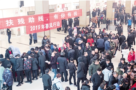 2月23日,瑞安市人力资源市场内人头攒动,由市残联、市民政局、市人社局等部门主办的瑞安市2019年春风行动——第五届残疾人就业招聘会在此举行。