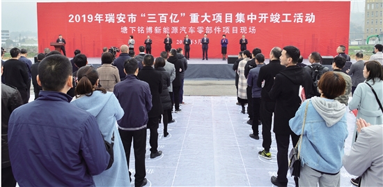 市委副书记、市长麻胜聪在致辞中指出,“大抓项目、抓大项目”的集结号已经吹响,各地各有关部门要坚持把重大项目建设作为头等大事,以“开局就是决战、起步就是冲刺”的状态大干苦干拼命干,持续掀起一场全员擂台比拼的高潮,着力办好“乡镇街比拼现场”“功能区亮绩赛场”等项目比拼擂台赛,全力打一场重大项目建设攻坚战、资源争夺决胜战,为“加快融合发展、打造至美瑞安”建新功立新业,以优异成绩向新中国成立70周年献礼。要坚持以项目论英雄,大抓项目谋划盯引,力争今年列入省“152”工程项目10个,引进50亿级产业项目1个、10亿级项目6个以上;坚持以项目拼能力,大抓项目开工投产,确保工业、生态环境和公共设施、高新技术产业、民间投资均增长10%以上;坚持以项目比作风,大抓项目服务保障,确保重大项目早建成、早投产、早达效。