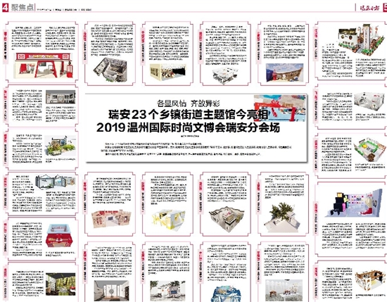 在2019温州国际时尚文博会上,“瑞安有喜”主题馆设在温州国际会展中心5号馆,以喜文化为主题,十余家瑞企携近百种文化创意精品亮相;瑞安设分会场,包括时尚特色文创礼品展示区和喜文化创意产品展示区。