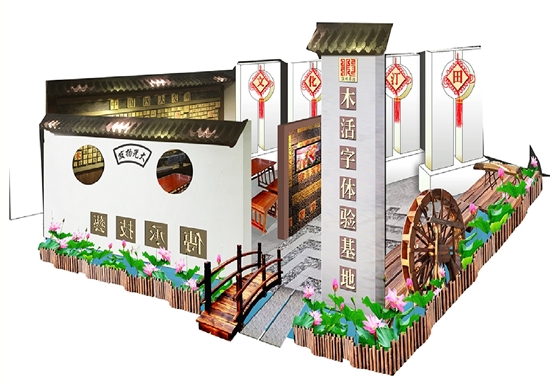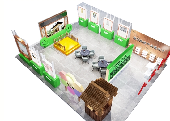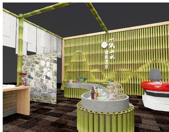 用造纸原材料竹子搭建的外围,搭配白色半透明纱布,辅以流水景观、水碓文化元素……芳庄乡主题馆将造纸文化与绿色环保理念相结合,整体展台主要展示本地特色产业及传统文化,将逛、看和体验实现有机统一。