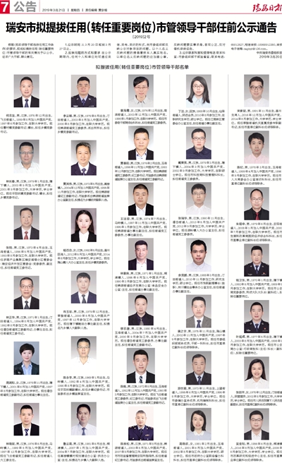 瑞安市拟提拔任用(转任重要岗位)市管领导干部任前公示通告
