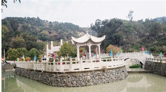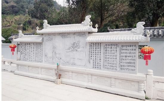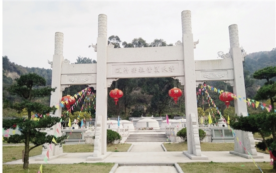 修葺后的墓群岚光如画:萦绕墓地的双溪清波荡漾,沿岸筑灰白石栏杆;东南一隅建筼筜亭,北边筑青脊白墙诗画照壁(图三);五座圆台形封堆墓换上灰白色墓石,安坐在墓地之上,前筑墓茔神道牌坊,和谐安祥(图四)。