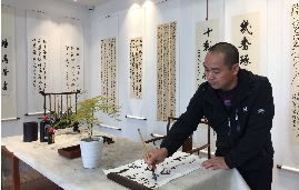 冯显斌今年48岁,是曹村镇许岙村人。“读小学时,我就爱上了书法。”冯显斌说,当时写书法叫写大字,大字课是他最喜欢的课程。而他写的大字,总能在课堂上得到老师的表扬,他的作品成为同学们的榜样。高中毕业后,冯显斌为了事业兜兜转转,到外地经商,闯过很多地方,不变的是书法的陪伴。“一天不写字就浑身难受。”有闲暇,冯显斌就捧起字帖,摊开笔墨,走进柳公权、欧阳询等古人的书法世界。