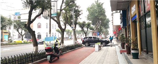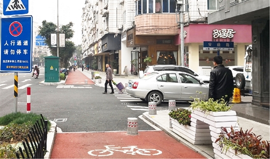 去年底,改造提升后的安阳路实行机动车双向四车道通行,取消了原先道路两侧的停车位。部分路段留出非机动车道,部分路段拓宽了人行道,并在人行道上铺设红色塑胶地面,供非机动车骑行。