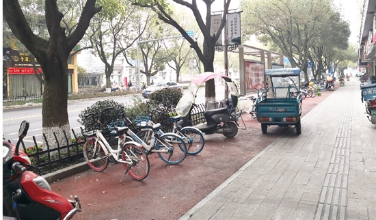 原本一路还算顺畅,但到了安阳路与安盛路交叉口时,一辆银色轿车挡住了去路,虽然没有挡住非机动车道,但是完全遮挡了路口的斑马线。继续往前,快到市中医院时,又出现了一黑一白两辆SUV轿车,分别停放在两条小路的路口,遮挡了非机动车道和人行道。记者骑车继续前行,经过安阳实验小学后,成排的电动车、自行车停放在非机动车道上,只能绕道。