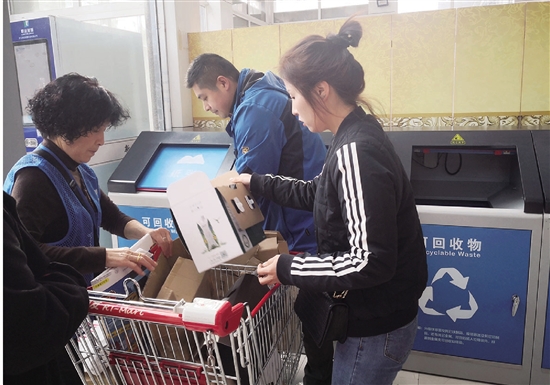 昨日,记者来到新江南人家小区,看见居民史小姐正推着装满废纸盒的购物车来到四分类垃圾箱前(如图)。史小姐掏出智能垃圾分类卡,对准扫描区域,按下相应按钮,写有“纸质”字样的垃圾箱自动打开,她将一车的废纸盒倒入其中。7秒后,垃圾箱屏幕上显示出纸盒总重,并自动更新了卡上积分。“每次收完快递都不知道怎么处理这些废纸盒,有了垃圾分类箱,不仅让这些纸盒‘有家可回’,而且能积攒积分兑换礼品,真是两全其美!”史小姐说,目前她的卡上已有数千积分。