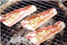 烤五花肉这种油脂较大的肉类时得把肉往外圈放,免得猪油滴入炭盆时燃起的火焰让人无从下手。丰富的油脂在口中炸开,肉片边缘焦脆,瘦肉部分多汁又有嚼劲,包着生菜吃是地道的吃法,褪去了多余的油脂,一口下去爽到没朋友。