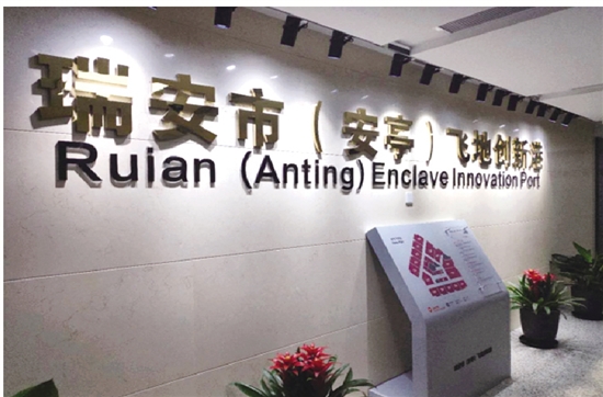 2019年4月,瑞安市(安亭)飞地创新港试投运,是瑞安·安亭协同创新发展“1235”计划的重大项目。瑞安市(安亭)飞地创新港位于上海安亭绿地商务楼,聚力聚焦飞地研发、飞地引智、飞地信息、飞地政策等四大服务功能,走出“研发在外地、成果转化在瑞安”的离岸研发新路子。目前,已首批入驻7家企业。