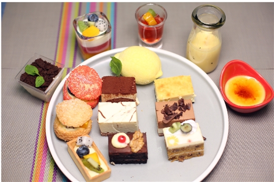 这边刚拉住静香,那边啵姐又开始被蛋糕柜里琳琅满目的甜点给迷住了。奶冻、焦糖布丁、马卡龙、慕斯蛋糕……多看一眼都是在呼唤味蕾!难怪最后当大家都瘫坐不动,准备扶墙而出的时候,啵姐揉揉肚子站了起来,又去端了满满一盘甜点回来了。服气!乘着啵姐消灭甜点的空档,这边复活的几人又跑去端了当季的水果回来,杨梅、荔枝、龙眼……而且还都不是那种平民水果。