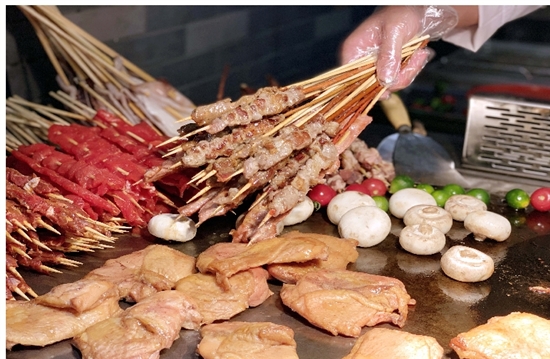 吃完小龙虾,不撸个串,总感觉留了遗憾。又逛到了超受大家喜爱的铁板区,羊肉串、牛肉串、鱿鱼、猪肉串、鸡排、牛排……闻着空气中的肉香,揉揉肚子感觉可以再来一次。现煎牛排稳坐抢手货首席宝座!看着血红的牛排逐渐变色,淋上些许黑椒汁,咬一口,肉香随着汁水迂回在口腔,简直难以把控强烈肉欲啊。同样的食材,除了铁板烧之外,还能进行果木碳烤,红彤彤的炭火前,肉串们滋滋作响的唱着歌,闪着诱人的油光,等待着孜然、椒盐、辣椒、五香粉,辛辣把他们装扮起来后,啵姐就会伸出魔掌。