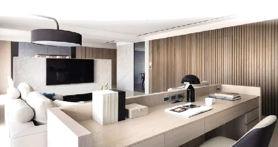 现在瑞安越来越多的年轻人取消掉电视墙,只保留电视柜。当电视柜变成一个类似于矮柜隔断时,其反面则可成为餐边柜收纳。空间明亮开阔,回形动线更加明亮开阔。