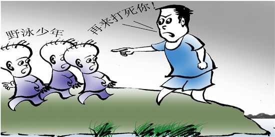 媒体报道,路遇一群小学生在河里野泳,孝感一男子将其全部赶走,并破口大骂“再来打死你”。其拍下的视频被发到网上后,引来众网友点赞:第一次听到骂人也这么动听。 (陶小莫画)