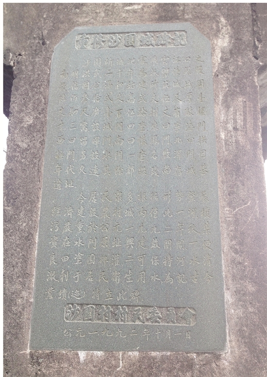 沿东门街徜徉,两边未发现古住宅古建筑,倒是有些巷名古色古香。在东门街的尽头,“沙园城”的西面,是一片葱茏的田野,一条悠悠的小河环绕着,有一种江南水乡的味道。依着小河往南走,路旁有一座“革命烈士汤志清纪念碑”毗邻村办公楼,村里立纪念碑还是第一次看到。在西南角有一座水泥构造的水闸,将相交的两条小河合二为一,东西走向穿过“沙园城”,这会不会属于当年的“护城河”?水闸的梁臂上镶嵌着小小的“重建沙园城碑记”,刻着“今居民众多,根据形势发展,农村经济建设,城内仅此一河积污严重,于公元1992年秋集资在水门原址兴建水闸,一便良田涂园排灌,二可保持河水清澈、利于居民用水……”